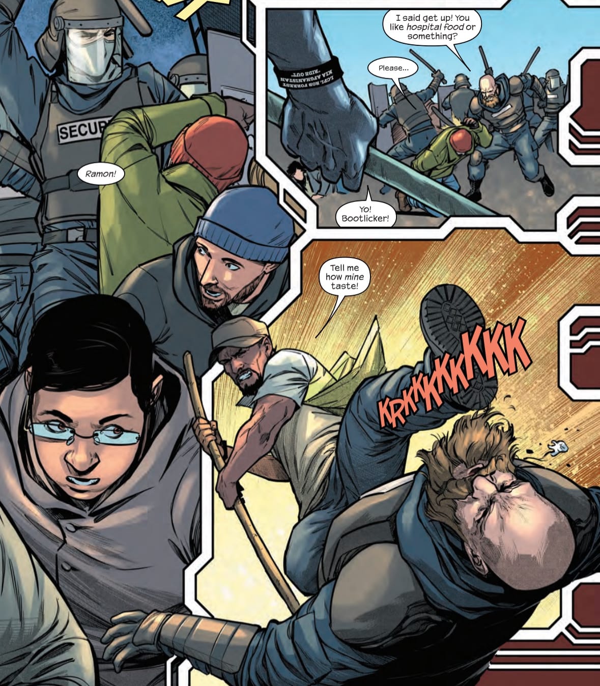 I WISH YOU A MEANINGFUL MEMORIAL DAY. Here's a piece I wrote for Memorial Day last year. But I also want to include these panels from IRON MAN #8, as our hero union organizer Ramon Vicente, a Marine veteran of Afghanistan, wears a wristband memorial for his fallen friend, a fictionalized version of the man known as Sergeant Rob in REIGN OF TERROR (sorry I made you a Marine in the comics, you would have laughed at that), while he protects his brothers and sisters on the picket line.