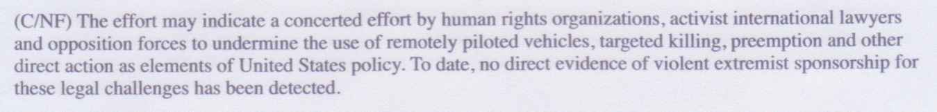 “The effort may indicate a concerted effort by human rights organizations, activist international lawyers and opposition forces to undermine the use of remotely piloted vehicles, targeted killing, preemption and other direct action as elements of United States policy,” the document states.